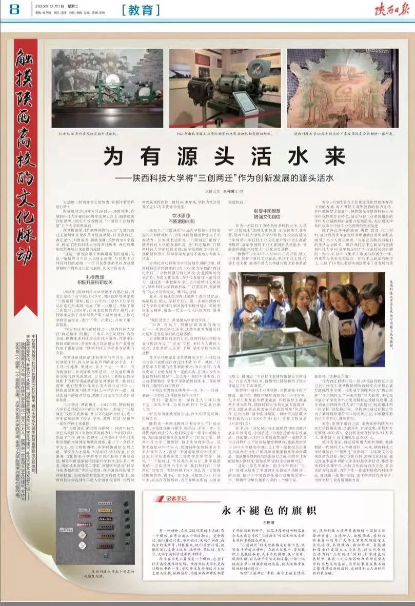 12月1日,《陕西日报》八版以《为有源头活水来——陕西科技大学将“三创两迁”作为创新发展的源头活水》为题,整版报道我校西迁历史、西迁故事和近年来取得的成绩。陕西科技大学作为“西迁群体”之一,在六十多年的发展历程中,历经“三次创业、两次搬迁、一次划转”的奋斗与辉煌,秉承以“自强不息、艰苦奋斗的创业精神,求实创新、锐意进取的科学精神和扎根西部、服务社会的奉献精神”为内涵的“三创两迁”精神,培养出一批勇于实践、善于创新的优秀学子,为国家建设和社会发展做出了重要贡献。全文转载如下: