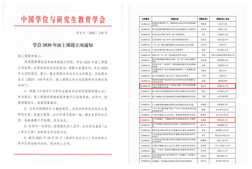 近日,中国学位与研究生教育学会公布了2020年面上课题立项结果,我校材料科学与工程学院蒲永平教授申报的《地方行业特色型大学“三机制六维度”研究生教育质量保障体系研究与实践》、教育学院武建鑫副教授申报的《基于科教融合、产教融合的研究生教育协同育人机制研究》2个项目获批立项,这是我校首次获得中国学位与研究生教育学会研究课题立项,立项数量在陕西省属高校中位列第三。