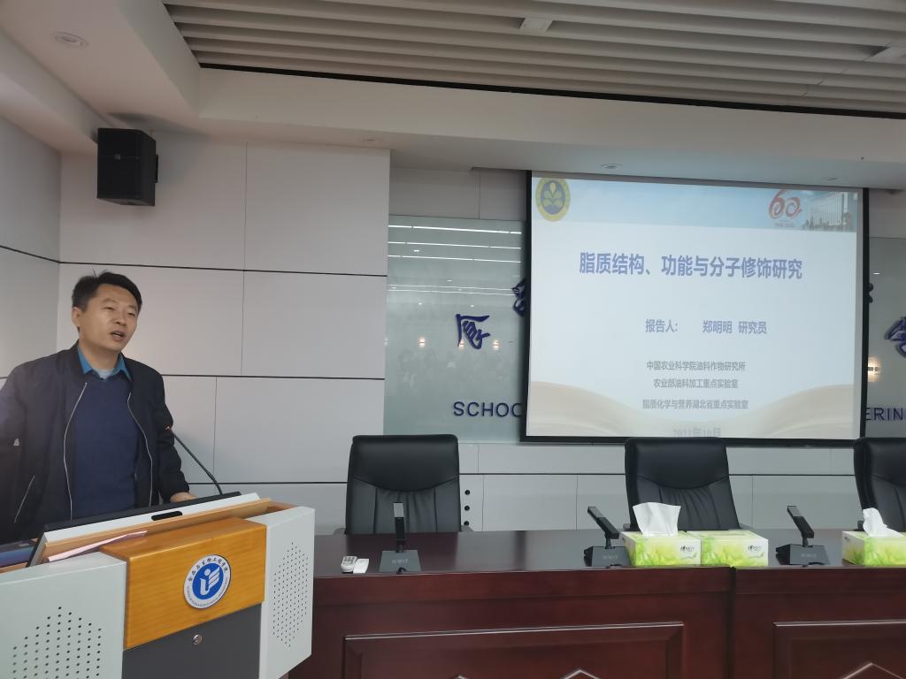 10月13日上午,中国农业科学院油料作物研究所郑明明研究员应邀做客我校,作了题为“脂质结构、功能与分子修饰研究”的学术报告,食品与生物工程学院教师和研究生代表参加了本次报告会。报告会由食品学院副院长李国梁教授主持。