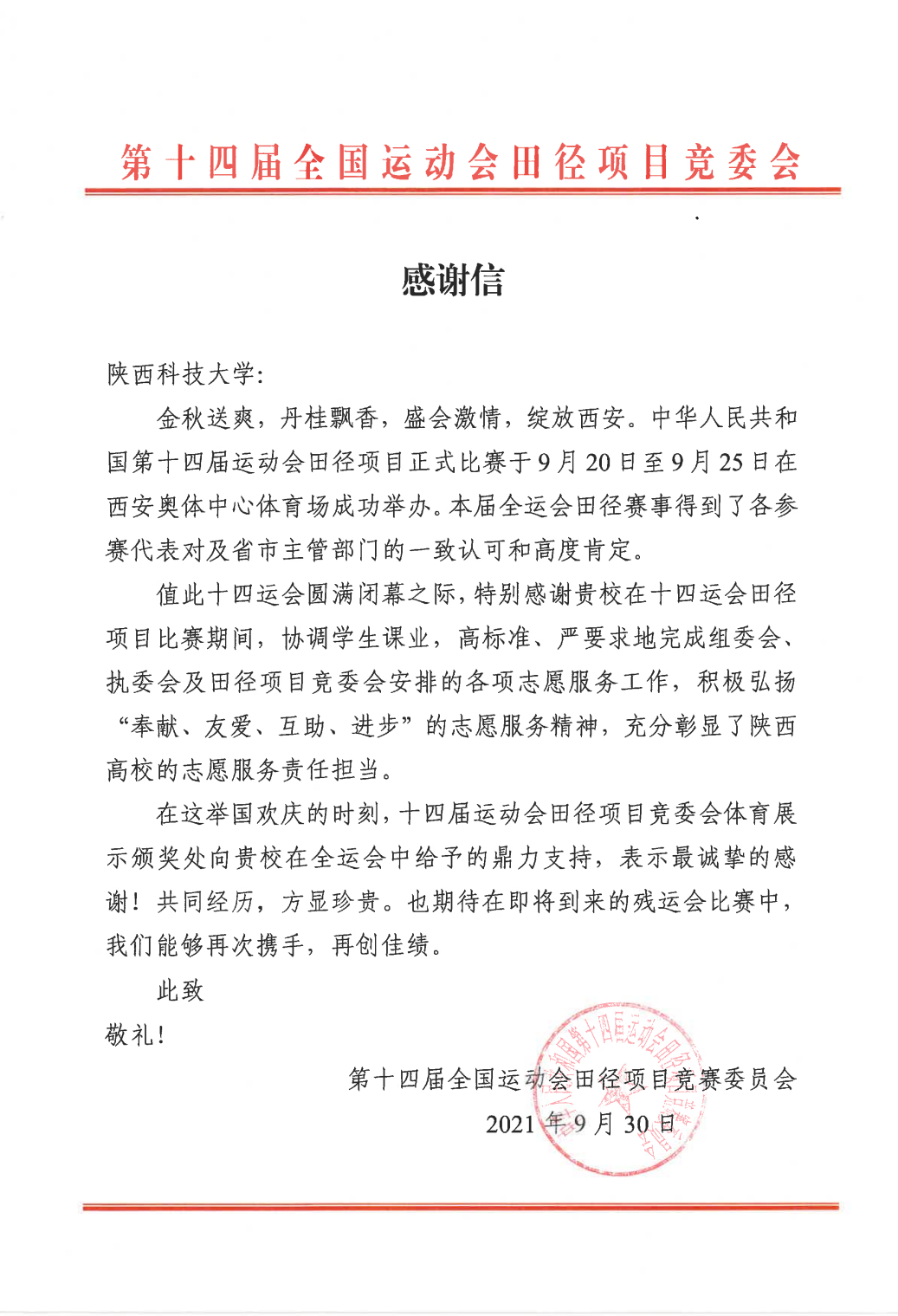 近日,我校收到第十四届全国运动会田径项目竞赛委员会发来的感谢信,竞委会在信中对我校257名志愿者在十四运会田径项目的志愿服务给予了高度的肯定,并对我校大力支持十四运会志愿服务工作表示了感谢。