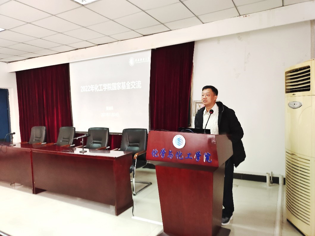 11月14日下午,化学与化工学院在实验楼1A302会议室召开2022年国家基金申报动员会,副校长黄剑锋出席并做动员报告。科技处处长助理徐卫涛、学院班子成员以及全院教师参加了会议,会议由院长费贵强主持。