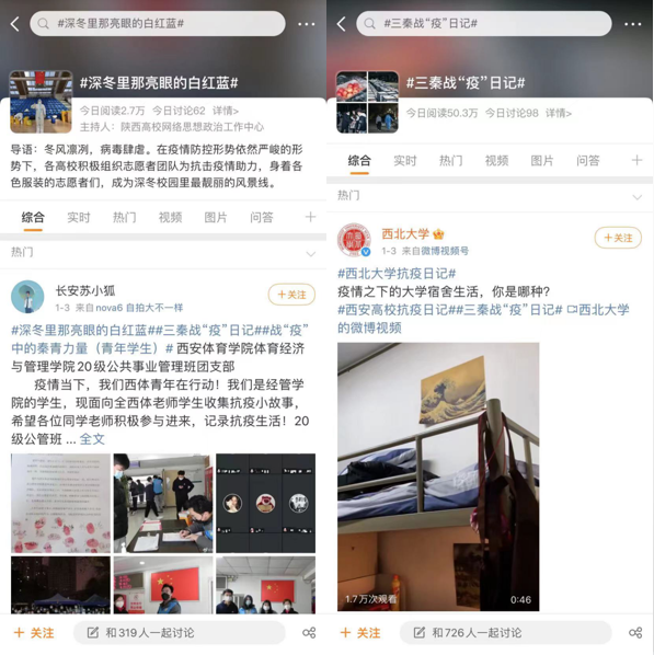 小话题闪耀青春光芒。此次活动的“高校青年战‘疫’日记”篇章,以微博为平台进行联动,目前发起的#深冬里那亮眼的白红蓝#、#战“疫”中的秦青力量#、#三秦战“疫”日记#等话题,已吸引全省60余所高校广师生参与讨论与传播,话题累计阅读量超过585万次。比如,我校学生在话题中写下自己的心路历程:“追着光,靠近光,成为光,散发光。”并配上了自己身穿防护服协助学校开展核酸检测的照片。西安建筑科技大学学生拍摄下志愿者们在大雪中送餐的红色身影并写到:“对我来说,这是最珍贵的一盒饭,也是最好吃的一盒饭。”本次微博联动真切展现了高校青年在抗疫过程中的成长进步与使命担当,有力推动了疫情防控工作的高效开展,为全省高校上好疫情防控“大思政课”奠定良好的基础。