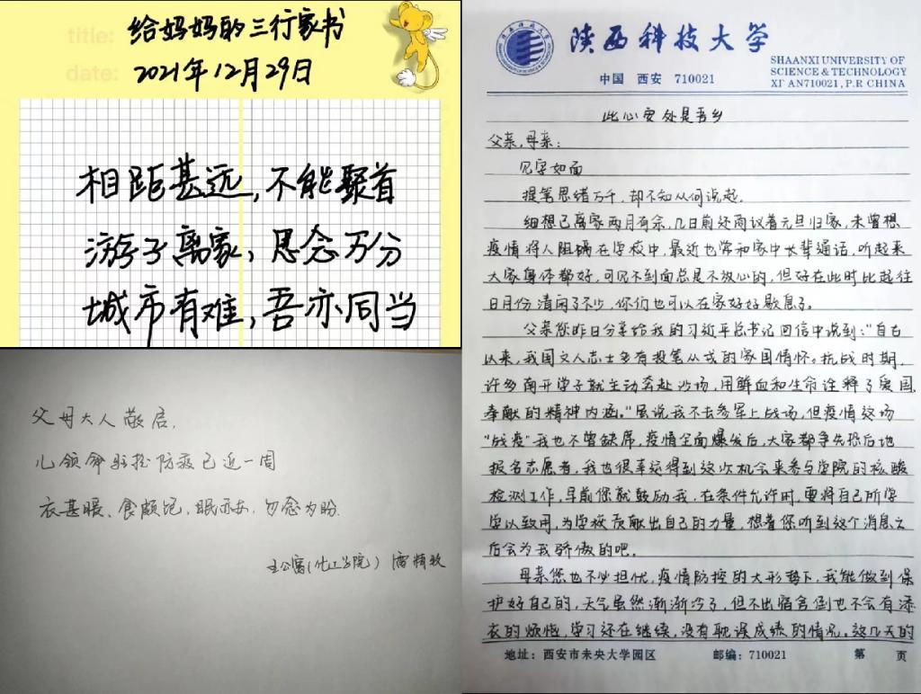 暖家书架起亲情桥梁。此次活动的“疫情中的学子家书”篇章,各高校通过广泛征集父母与学生间的平安信(微信、短信等形式),在新媒体平台进行集中展示,为暂时不能回家的学子带来亲情的支持。比如,在我校进行的“三行家书,待你亲启”活动中,信息181班学生刘苗写给妈妈:“相距甚远,不能聚首,游子离家,思念万分,城市有难,吾亦同当。”西安石油大学的一位学生家长在信中写道:“儿子,我希望你注意做好个人防护的同时,坚守住志愿者的岗位。没有哪一代人的青春不经过淬炼,只要你们心中有火、眼中有光,我们国家的明天一定会更加强大!”一封封饱含深情的家书将学生家庭纳入到了学校疫情防控的链条中,形成良好的家校联动机制,提升了高校疫情防控整体水平。