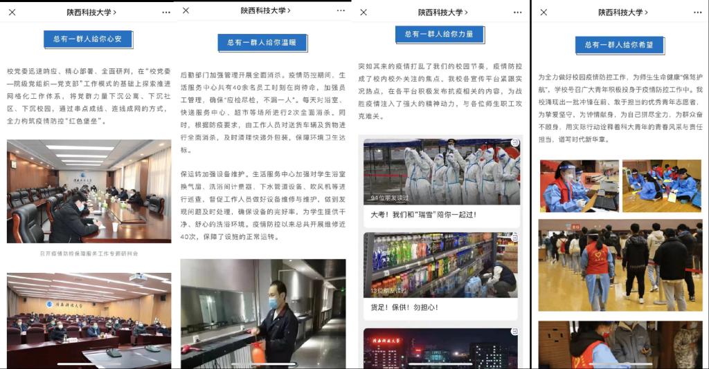 大接龙传递磅礴力量。此次活动的“高校青年战‘疫’故事”篇章,依托微信平台开展,陕西“高校青年同心战‘疫’@大接龙”活动吸引全省90余所高校积极参与,各高校依托学校官方微信公众平台发布本校在抗击疫情中的防控措施、暖心故事等,累计阅读量已超过70万+。比如,我校官微发布的推文《以吾之名守护》,用一个个“群体素描”记录了抗击疫情过程中发生在校园内外的温暖瞬间。西北工业大学发布的推文《看疫情防控中的西工大担当!》,集中展现了全体师生员工勇担使命、并肩抗疫,从严、从快、从细、从实抓好疫情防控工作的优良作风。本次@大接龙通过传递疫情防控中涌现出来的英模人物与感人事迹,让广大青年师生感受奋斗的激情,体悟奉献的伟大,实现思想共振、情感共鸣、行动共进。