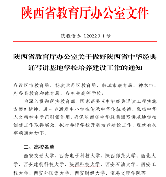 近日,陕西省教育厅办公室发布了《关于做好陕西省中华经典诵写讲基地学校培养建设工作的通知》(陕教语办〔2022〕1号),我校获批陕西省首批中华经典诵写讲基地学校。