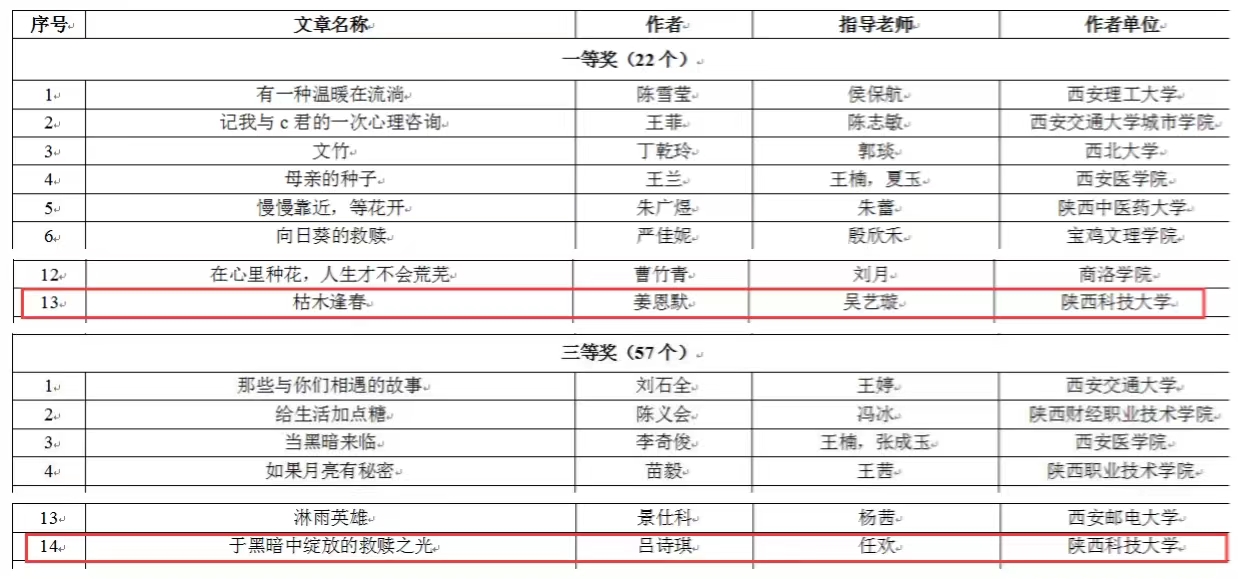 由设计与艺术学院辅导员吴艺璇指导、学生姜恩默的征文作品《枯木逢春》荣获第二届陕西高校“心相遇 爱同行——心理健康教育伴我成长”主题征文一等奖,该作品讲述了遭遇家庭变故而产生心理危机的大学生,在家长、教师、和朋辈的关心帮助下,获得心理蜕变与成长、找寻自我价值与优势。由电气与控制工程学院辅导员任欢指导、学生吕诗琪的征文作品《于黑暗中绽放的救赎之光》荣获三等奖,该作品讲述了一位曾经彷徨、迷茫的大一新生,在心理老师的帮助下发现自我、认识自我、完善自我,度过心理适应期、焕发心理活力的故事。