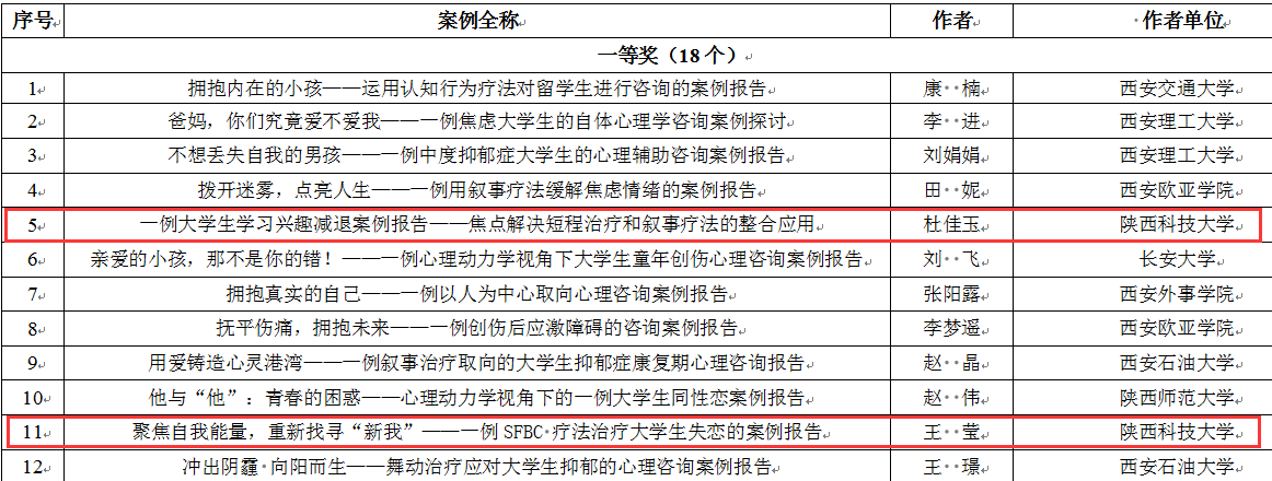 学工部心理中心教师杜佳玉的心理咨询案例《一例大学生学习兴趣减退案例报告——焦点解决短程治疗和叙事疗法的整合应用》荣获第八届陕西高校心理健康教育优秀咨询案例一等奖,该案例关注大学生的学习心理困扰和亲子问题,综合运用外化、故事重构等技术,引导学生认识自身优势,增强自我价值感和内驱力。同时,经济与管理学院辅导员王莹的心理咨询案例《聚焦自我能量,重新找寻“新我”——一例SFBC疗法治疗大学生失恋的案例报告》也荣获一等奖,该案例引导大学生科学理性的看待失恋,运用焦点解决技术帮助学生树立正确的恋爱认知,激发自身能量和潜力应对现实挫折。