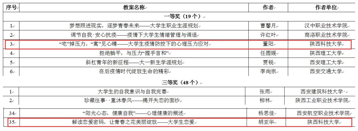 学工部心理中心教师董阳的心理教案《“宅”掉压力,“寓”见心晴——大学生疫情防控下的心理压力应对》荣获第四届陕西高校心理健康教育优秀教案一等奖,该作品聚焦疫情防控背景下大学生产生的心理压力感受,帮助学生积极调整、科学应对,健康自信的学习和生活。电子信息与人工智能学院辅导员胡亚华的心理教案《解读恋爱密码,让青春之花美丽绽放——大学生恋爱》荣获三等奖,该作品通过分析大学生的恋爱特点、恋爱类型,引导大学生树立科学的恋爱价值观,绽放美丽青春。