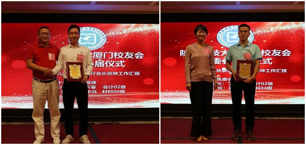 第九届执委会执行会长张坤(塑型95级)向大会报告本届执委会5年来厦门校友会的发展情况。李玉柱为新当选的第十届执委会执行会长丁东春(会计02级)授牌,张坤为新当选的第十届执委会秘书长吴中兵(材料04级)授牌。