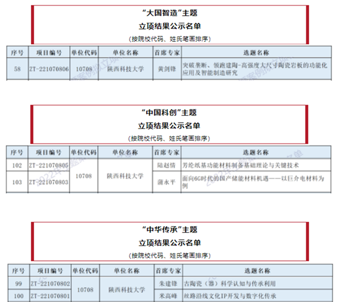 此次立项中,我校材料科学与工程学院(文物保护科学与技术学院)蒲永平教授主持的《面向6G时代的国产储能材料机遇——以巨介电材料为例》、轻工科学与工程学院(柔性电子学院)陆赵情教授主持的《芳纶纸基功能材料制备基础理论与关键技术》获批“中国科创”主题立项;材料学院黄剑锋教授主持的《突破垄断、领跑建陶-高强度大尺寸陶瓷岩板的功能化应用及智能制造研究》获批“大国智造”主题立项;材料学院朱建锋教授主持的《古陶瓷(器)科学认知与传承利用》、设计与艺术学院(丝路文化与传播学院)米高峰教授主持的《丝路沿线文化IP开发与数字化传承》获批“中华传承”主题立项。