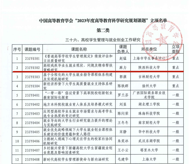 近日,中国高等教育学会公布了“2023年度高等教育科学研究规划课题”立项名单,由我校学生就业中心申报的《高校残疾毕业生就业现状、问题及精准帮扶策略研究》成功获批“高校学生管理与就业创业工作研究”重点课题。本次课题是我校就业创业研究领域首次成功立项的国家级高等教育科学研究规划重点课题。