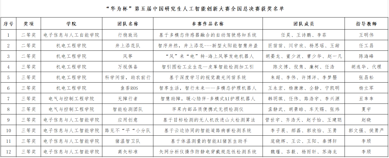 “华为杯”第五届中国研究生人工智能创新大赛于5月正式开赛,共有来自各地269个单位的1778支队伍报名参赛,经过激烈角逐,共有122支队伍晋级全国总决赛。我校“井上添花队”“风筝”“行稳致远”等3支代表队在指导老师的精心指导和同学们的共同努力下,在项目展示中表现优秀,均荣获二等奖。自开赛以来,研究生院(研工部)大力宣传,广泛动员师生参赛,联合机电工程学院(智能制造与机器人工程学院)共同承办校赛组织与选拔,遴选推荐26支队伍参加国赛,经激烈角逐,斩获12项国家奖项。
