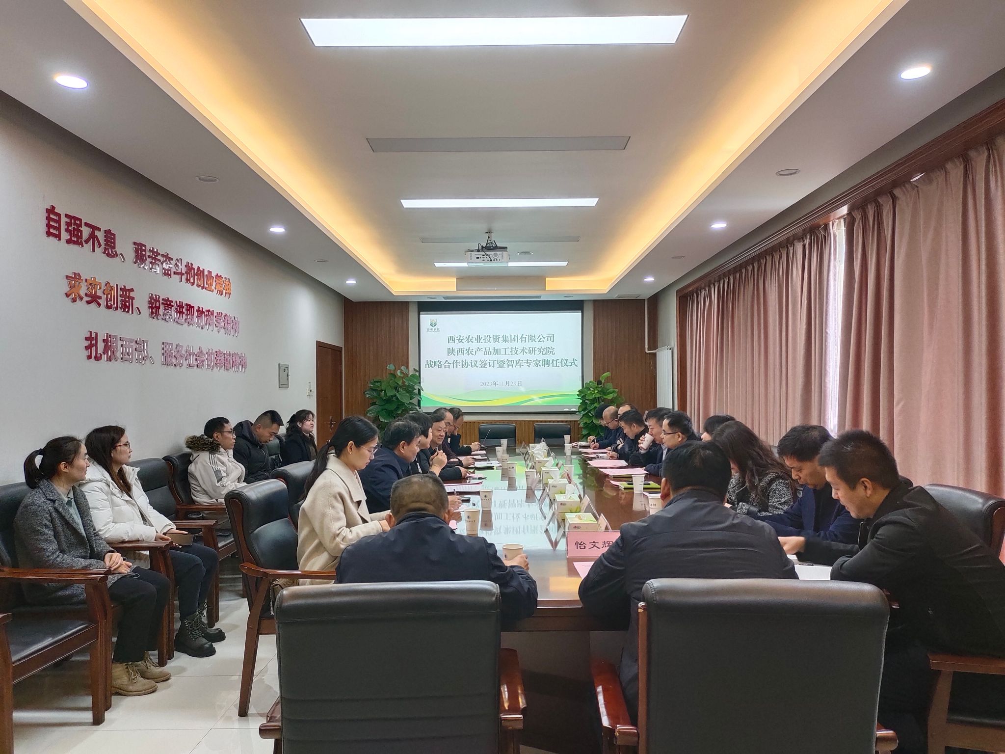 11月29日上午,西安农业投资集团有限公司党委书记、董事长成斌,集团党委委员、副总经理沈建锋等一行12人莅临我校,与陕西农产品加工技术研究院举行战略合作协议签约暨智库专家聘任仪式。我校副校长、陕西农产品加工技术研究院院长黄剑锋出席并致辞。农研院院长助理(主持工作)莫海珍及部分专家参加签约仪式。仪式由农研院首席顾问陈雪峰主持。