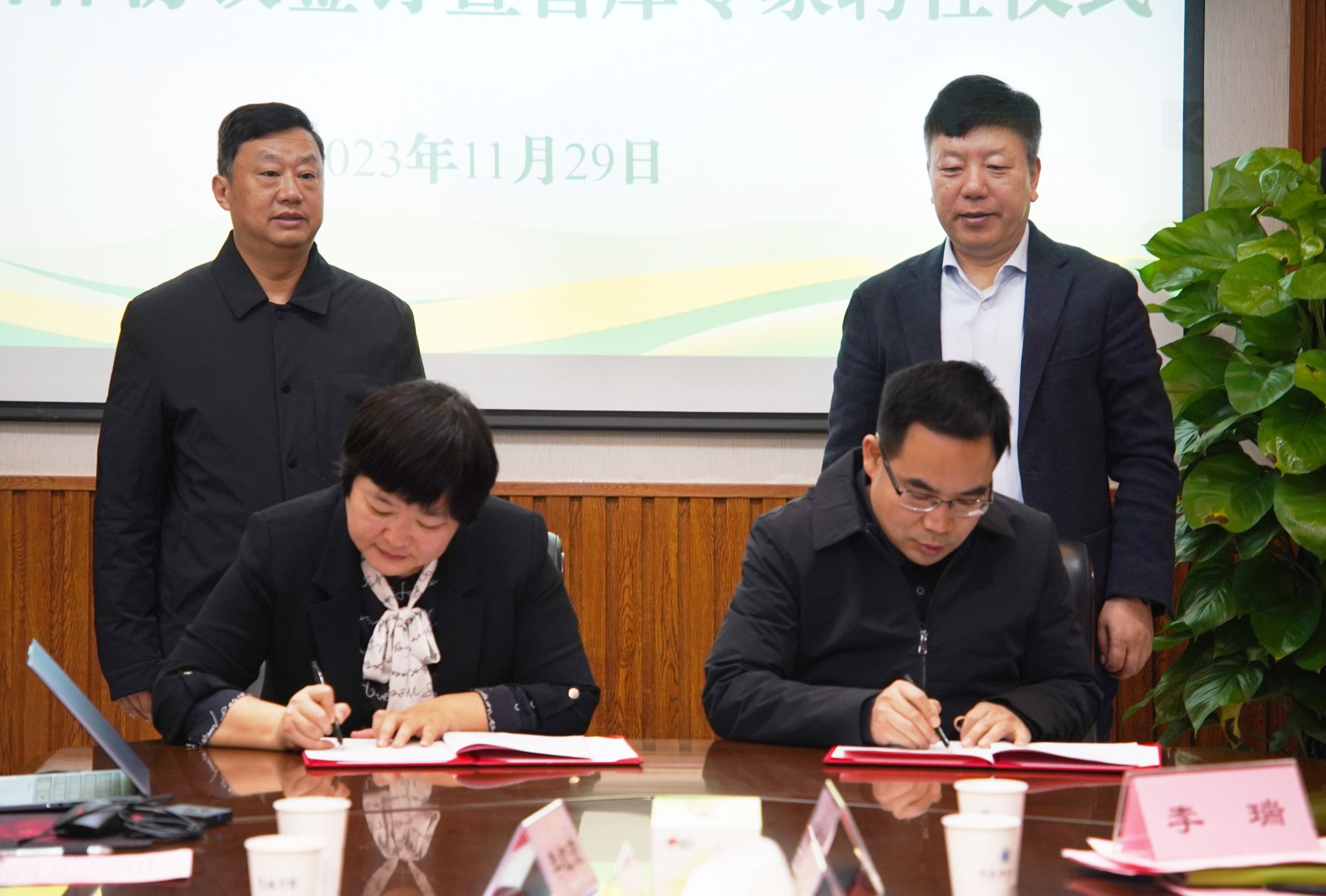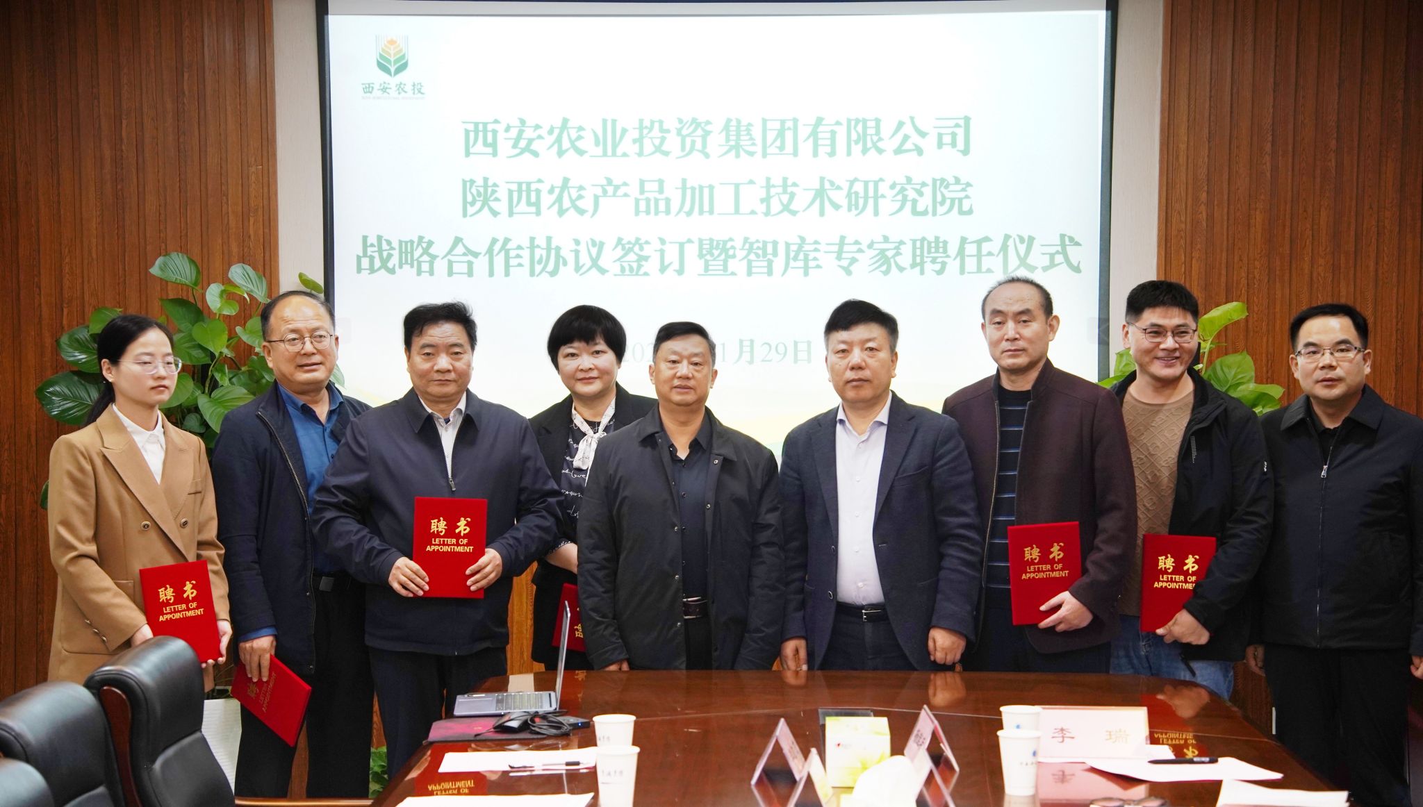 在双方人员的共同见证下,莫海珍代表农研院与西安农业投资集团有限公司签署战略合作协议,成斌为8位智库专家颁发聘书。