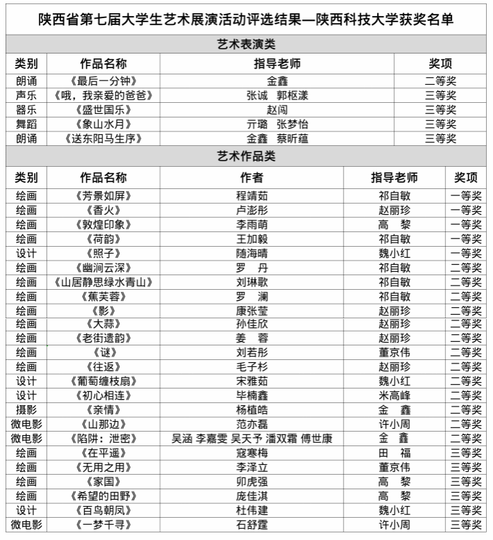 近日,由陕西省教育厅主办的全省第七届大学生艺术展演活动圆满落下帷幕。我校学子在本届赛事中共斩获29项奖项,取得历史最好成绩,充分展现了学生的艺术修养和学校的美育成果。