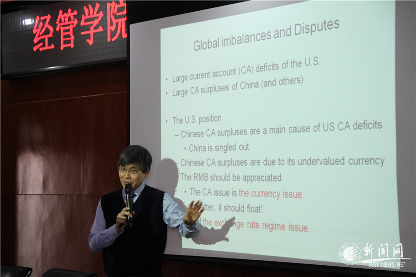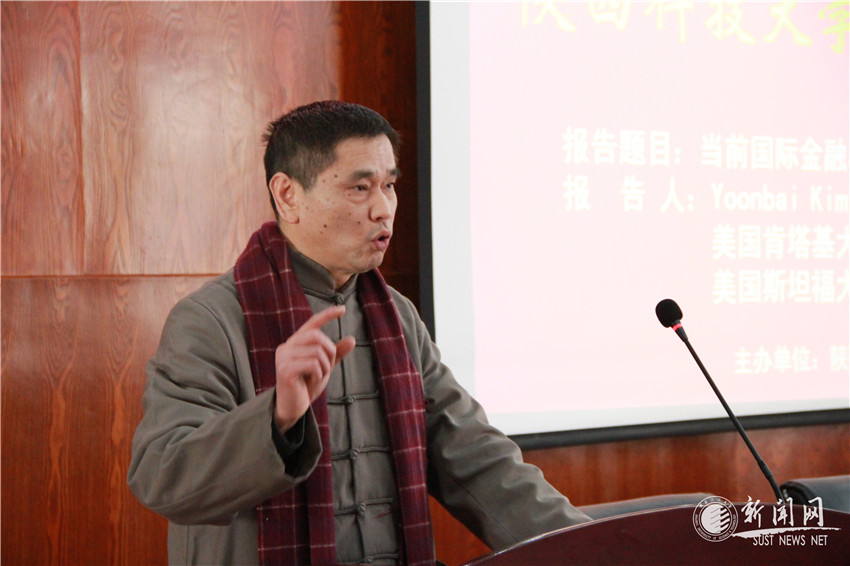 由经济与管理学院主办、国际合作与交流处联办的陕西科技大学“未央论坛”于11月23日上午在经管学院学术报告厅举行,美国斯坦福大学博士、肯塔基大学经济学系金润培(Yoonbai Kim)教授受邀为广大教师和研究生作了题为“当前国际金融与宏观经济学问题”的学术报告,论坛由经管学院院长马广奇主持。