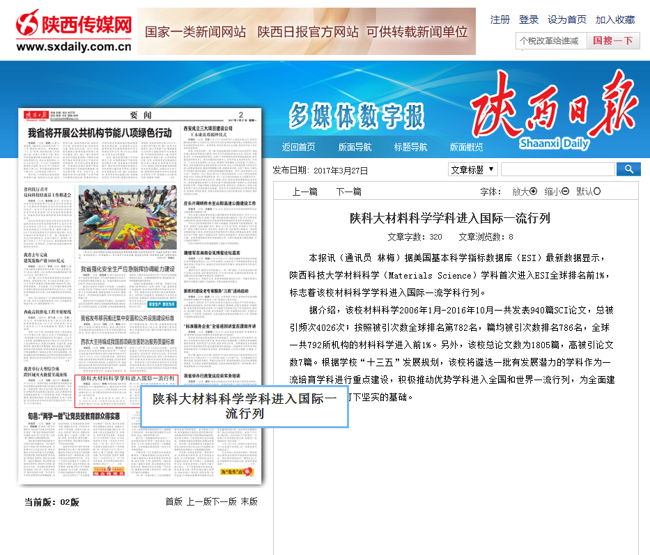 陕西日报3月27日在“要闻”版以《陕科大材料科学学科进入国际一流行列》为题,报道了我校材料科学学科首次进入ESI全球排名前1%的新闻,全文转载如下: