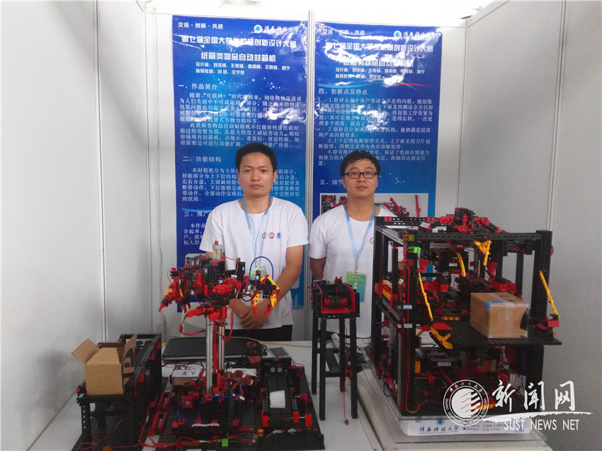 7月26日至29日,由全国大学生机械创新设计大赛组委会和教育部高等学校机械基础课程教学指导委员会主办、山东交通学院承办的第七届全国大学生机械创新设计大赛决赛举行。我校慧鱼作品“纸箱类物品自动封箱机”由闫茹、王宁侠两位老师指导,刘泽锋、王传锋、强振峰、王晓悦、杨宁五位同学完成,属于快递物品的包装机械,设计思路新颖,机电气结合,功能多样,经过学校准备和激烈的赛区赛,成功晋级全国决赛并获一等奖,这是我校连续第三次取得该项赛事全国一等奖。