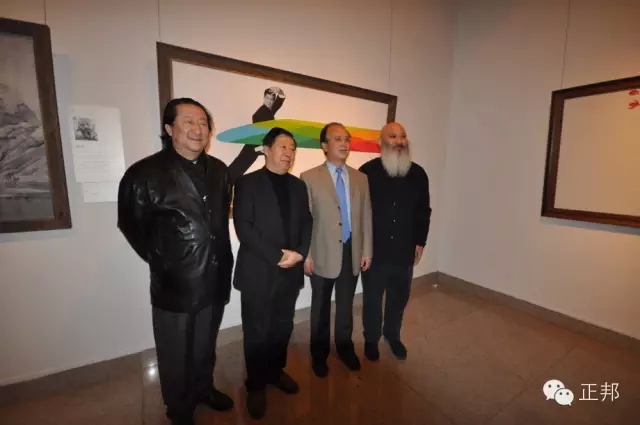 展览中,国家文化部副部长丁伟、中国美术家协会主席刘大为、中国国家画院院长杨晓阳在陈丹先生的作品前合影留念。