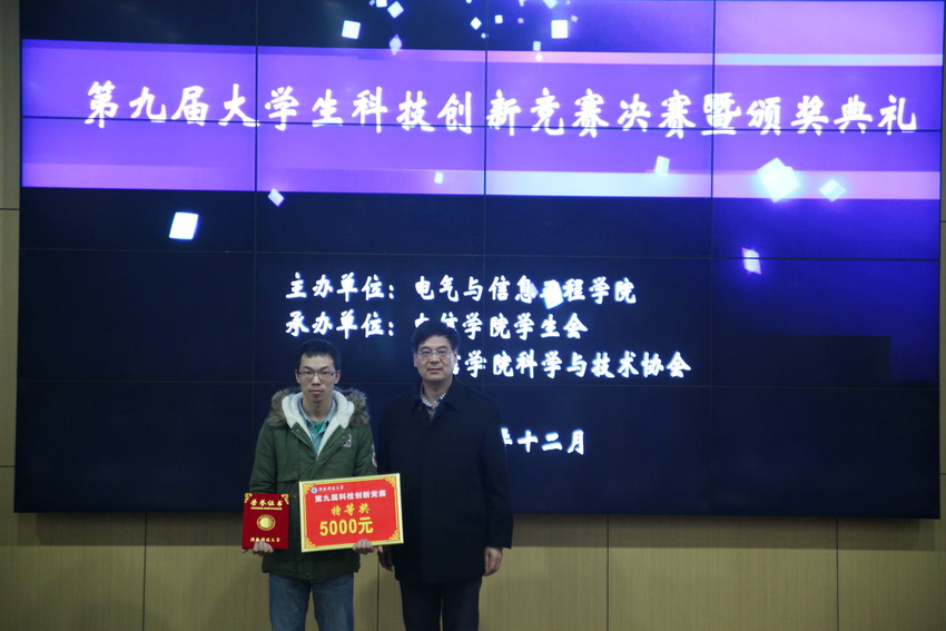 2015年12月30日晚,我校第九届科技创新大赛决赛暨颁奖仪式现场气氛热烈,经过激烈的角逐,电气与信息工程学院的刘强等同学的作品《联想心房》一举摘取特等奖的桂冠,《3D照相馆》、《基于LabVIEW的智能导向停车场》两件作品双双荣获一等奖,其余五组作品分别获得二等奖。新一批“创新之星”已从这项我校最具影响力的科技类赛事上冉冉升起,将从这里走向更宽、更广阔的舞台。