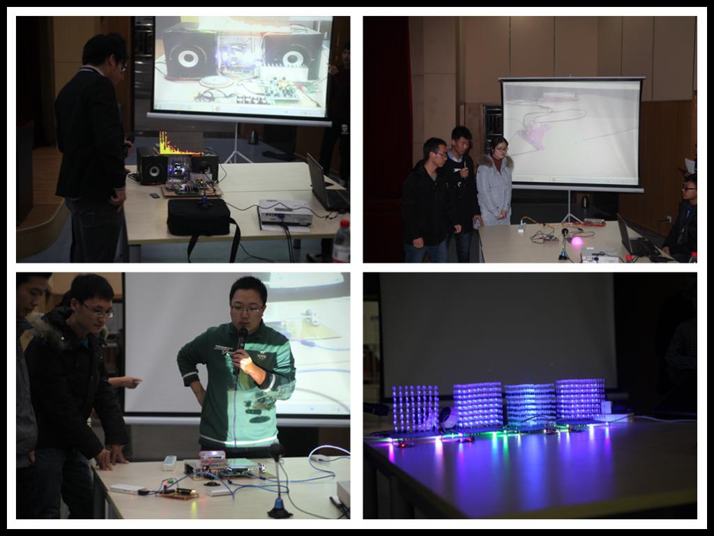 决赛当晚亮点不断,创意无限。8支入围团队依次上台进行作品展示和公开答辩。《基于ARM的双通道立体声人机交互式音乐播放器》利用“互联网+”技术控制3维立体图案和音乐的播放,充分活跃了现场的气氛;《PWM配光灯》为一款家用调色配光灯,以新颖的颜色带给大家浪漫的享受;《光学测距仪》利用超声波定距追踪小车,速度与功能的完美融和让人赞不绝口;《联动心房》独特的造型设计和酷炫的LED效果让全场人员心跳加速;《3D服装屋》各色的精美服装只为您量身定做;《基于LabVIEW的智能导向停车场》便捷停车一步到位;《3D照相馆》通过全新体验的打印技术,获得立体的3D模型;《基于单片机的音乐喷泉》带你走进真实的单片机世界。