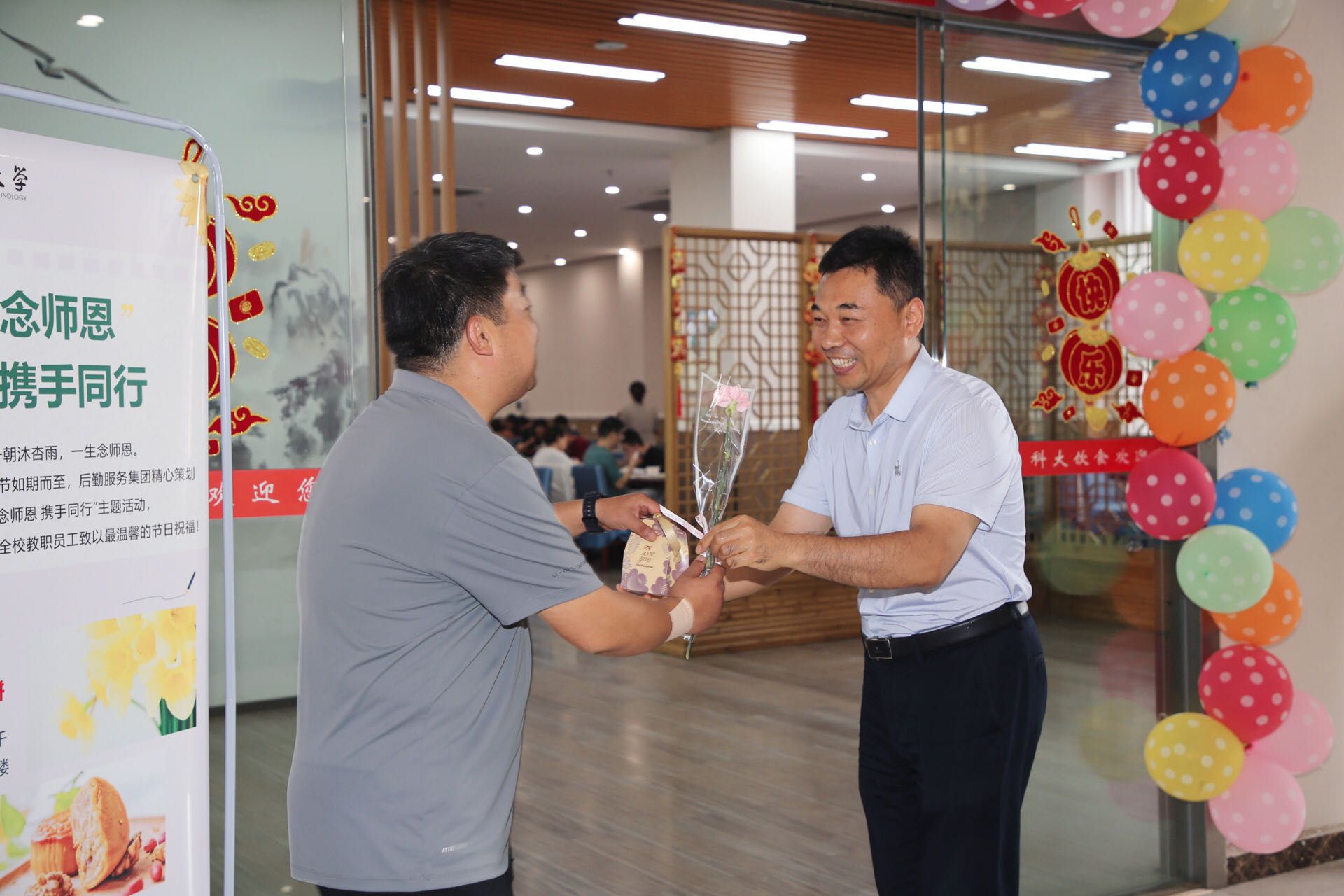 清晨,当第一缕阳光洒满校园,后勤集团的工作人员便忙碌起来,他们手捧一朵朵精心挑选、色彩斑斓的鲜花和新鲜出炉的月饼,将这份特别的礼物送到每一位前来就餐的老师手中。