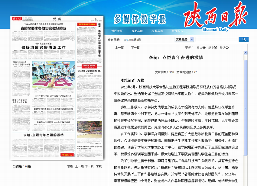 陕西日报6月4日4版“要闻”以《李萌:点燃青年奋进的激情》为题,报道我校优秀辅导员李萌入选3月“中国好人榜”“敬业奉献好人”的先进事迹。“中国好人榜”评议活动由中央文明办主办、中国文明网承办。此前,李萌被评为陕西省2015年11-12月“陕西好人榜”“敬业奉献类”“陕西好人”。