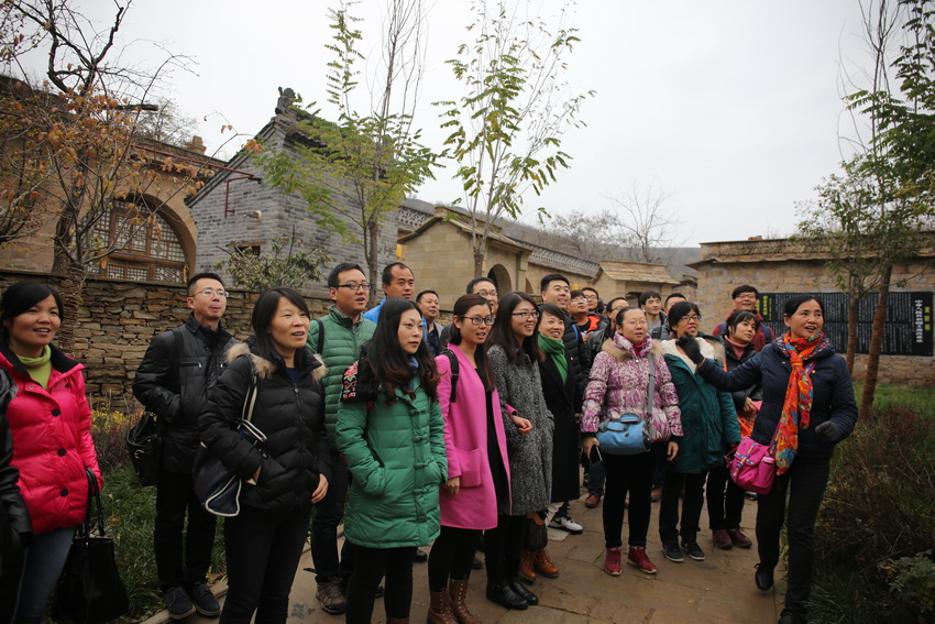 来到枣园革命旧址的时候,金灿灿的阳光正照耀在革命英雄雕像前,远处的枣树上还有未掉落的大红枣,延安姑娘热心地为大家唱起民歌——“大红枣儿甜又香,送给咱亲人尝一尝,一颗枣儿一颗心,心心向着共产党”。走在延安城里,大家随时都会被人民群众的淳朴与热情所感染,作为革命圣地,这里的人民与党和军队有着浓得化不开的深情,每到一处革命旧址,老乡就会热情地为大家唱一段,“骑白马,跨洋枪,三哥哥吃的是八路军的粮”,“山丹丹开花红艳艳,咱中央红军到陕北”,“羊肚子那个毛巾哟三道道蓝,红军哥哥跟的是刘志丹”。那种充满了革命乐观主义精神的热情与高亢,让人满怀振奋与激昂。在文安驿古镇上的歌谱碑前,青年教师们也情不自禁地唱起了《东方红》:“东方红,太阳升,中国出了个毛泽东...”那是从内心汩汩流出的声音,是发自内心对毛泽东思想、对革命精神的崇敬。