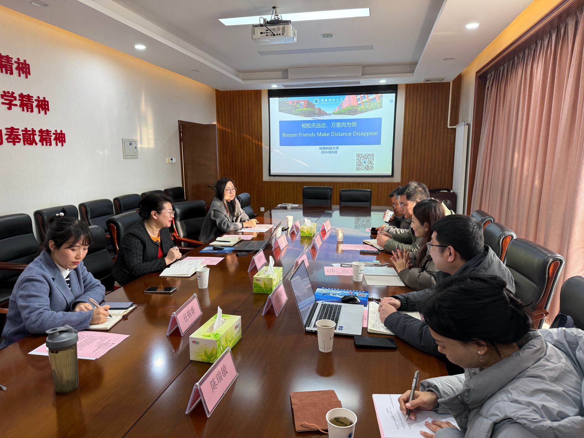 在国际处交流座谈中,国际处处长张素风对韩萍副局长一行的来访表示欢迎,并介绍了陕西科技大学国际化办学特色及近年国际交流合作成果,并表示学校积极响应国家“一带一路”倡议,通过国际联合科研、学术互访、国际学术会议等形式持续拓展合作网络,为校地高质量发展注入国际化动能。韩萍副局长对学校国际科技工作做出了积极肯定,并详细介绍了西咸新区在推进国际科技创新交流合作中的重点举措及政策支持体系,给出了双方开展国际科技合作的路径建议,同时表示将积极搭建校企产学研合作平台,推进双方更深层次合作。