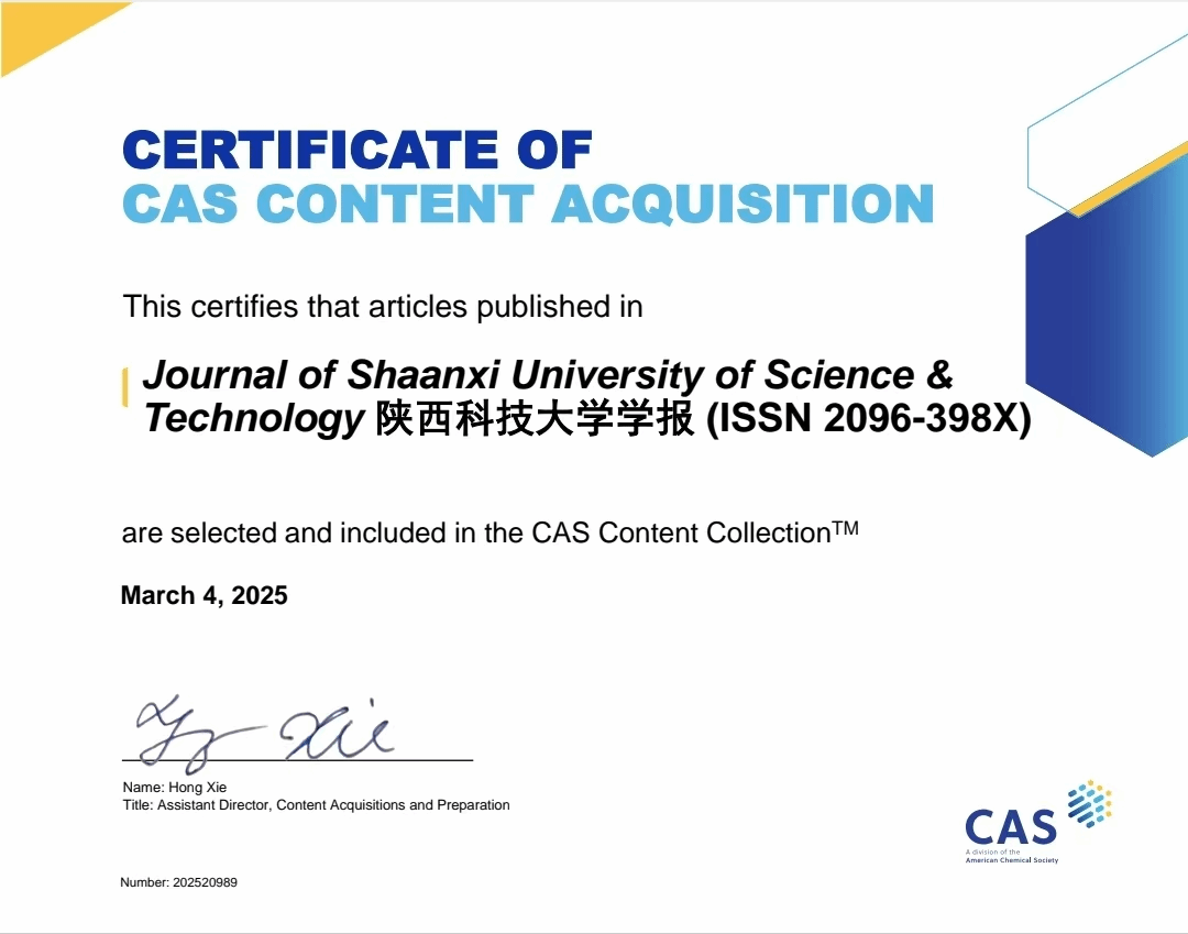 2025年3月4日,《陕西科技大学学报》在经过前期申报及美国化学文摘社(Chemical Abstracts Service,CAS)的多轮严格评估后,最终被全球权威数据库美国化学文摘(Chemical Abstracts, CA)正式收录。这是本刊继被《俄罗斯文摘杂志》(AJ)、《英国食品科技文摘》(FSTA)、《美国艾博思科全文数据库》(EBSCOhost)、《美国乌利希国际期刊指南》(UPD)等大型国际数据库收录后,再次被国际知名数据库收录。将进一步提升《陕西科技大学学报》的期刊国际影响力,拓宽加深学报论文的国际传播广度和深度。