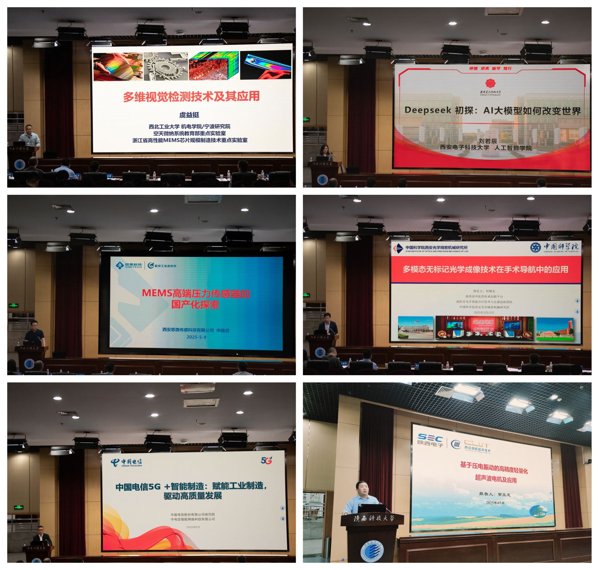 大会邀请西北工业大学常洪龙和虞益挺、西安交通大学林启敬、火箭军工程大学贾瑛、西安电子科技大学刘若辰、西安思微传感科技有限公司申建武、中国科学院西安光机所何镇安、中国电信研究院李雪峰、陕电集团西京电气集团电子技术研究院贺立龙等作报告,从“‘纸’飞机研究进展”、“机器人柔性传感器及其关键技术研究”、“羧基氧化石墨烯复合电极材料检测偏二甲肼研究”、“多维视觉检测技术及其应用”、“DeepSeek初探:AI大模型如何改变世界”、“MEMS高端压力传感器的国产化探索”、“多模态无标记光学成像技术在手术导航中的应用”、“中国电信5G+智能制造:赋能工业制造,驱动高质量发展”、“基于压电振动的高精度轻量化超声波电机及应用”等方面分析国内外智能制造与传感探测领域的最新前沿及发展趋势。