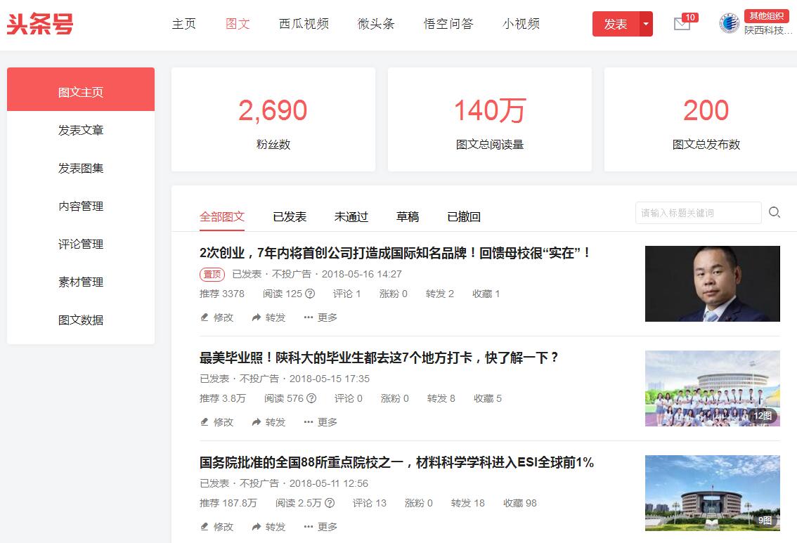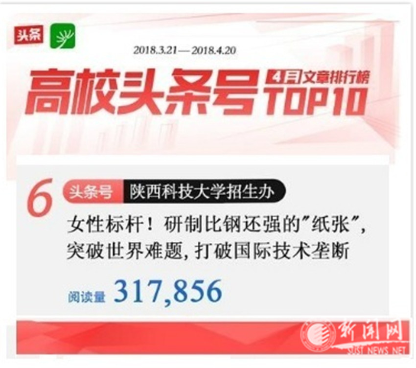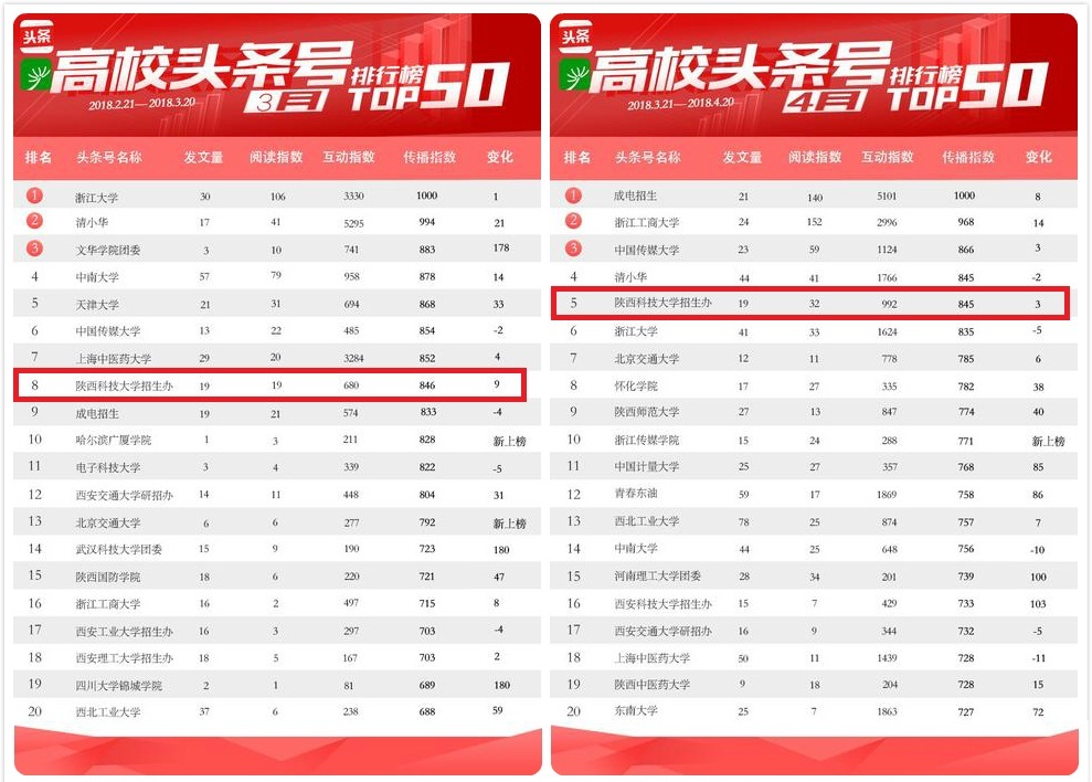自2017年5月“陕西科技大学招生办”头条号开通以来,教育部头条号“微言教育”联合“今日头条”官方对全国千余所高校累计评选的10期榜单中,招生办头条号在全国高校排名中屡创新高,社会关注度不断提升,累计6次进入全国榜单前十五,8次进入全国同类型账号前三名,5次获得全国同类型账号第一,6次获得陕西同类型账号第一。今年3、4月,分别列全国高校第8位和第5位,全国高校同类型账号冠、亚军,持续刷新榜单记录。