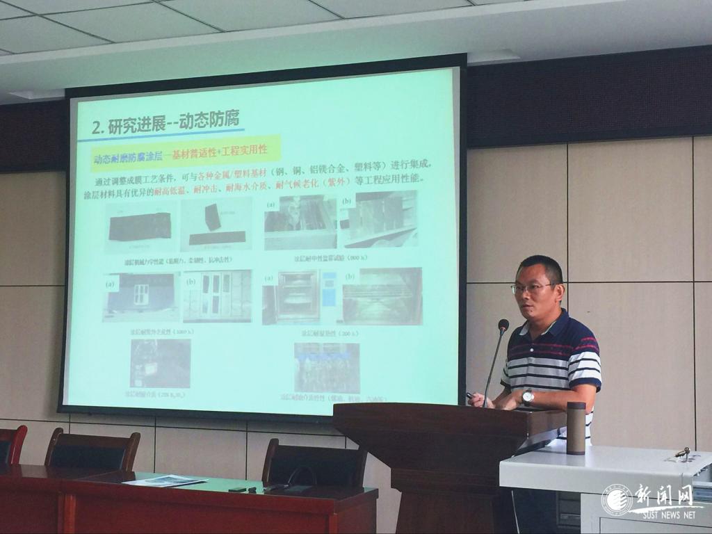罗荘竹教授的报告围绕“南海海洋纵深开发”中遇到的高温、高湿、高盐、高紫外热带海洋环境的动态磨损与腐蚀协同损伤、冲蚀腐蚀、流体阻力及海生物污损等问题,创新性地提出一种自润滑防腐功能一体化高分子合金涂层构筑新原理,系统地介绍了动态耐磨防腐涂层制备与使役的科学问题,并探讨了动态耐磨防腐功能一体化涂层材料领域产学研用及军民融合的新模式。罗教授的报告深入浅出,结合自己20的科研经验,阐述了一个科研者如果要获得成功,必须具有工匠精神,把心沉下来,努力做好每件事。报告后罗教授与参会的教师和同学展开了热烈的讨论,罗教授的报告进一步拓宽了师生在相关领域的思路,师生们收获颇丰。