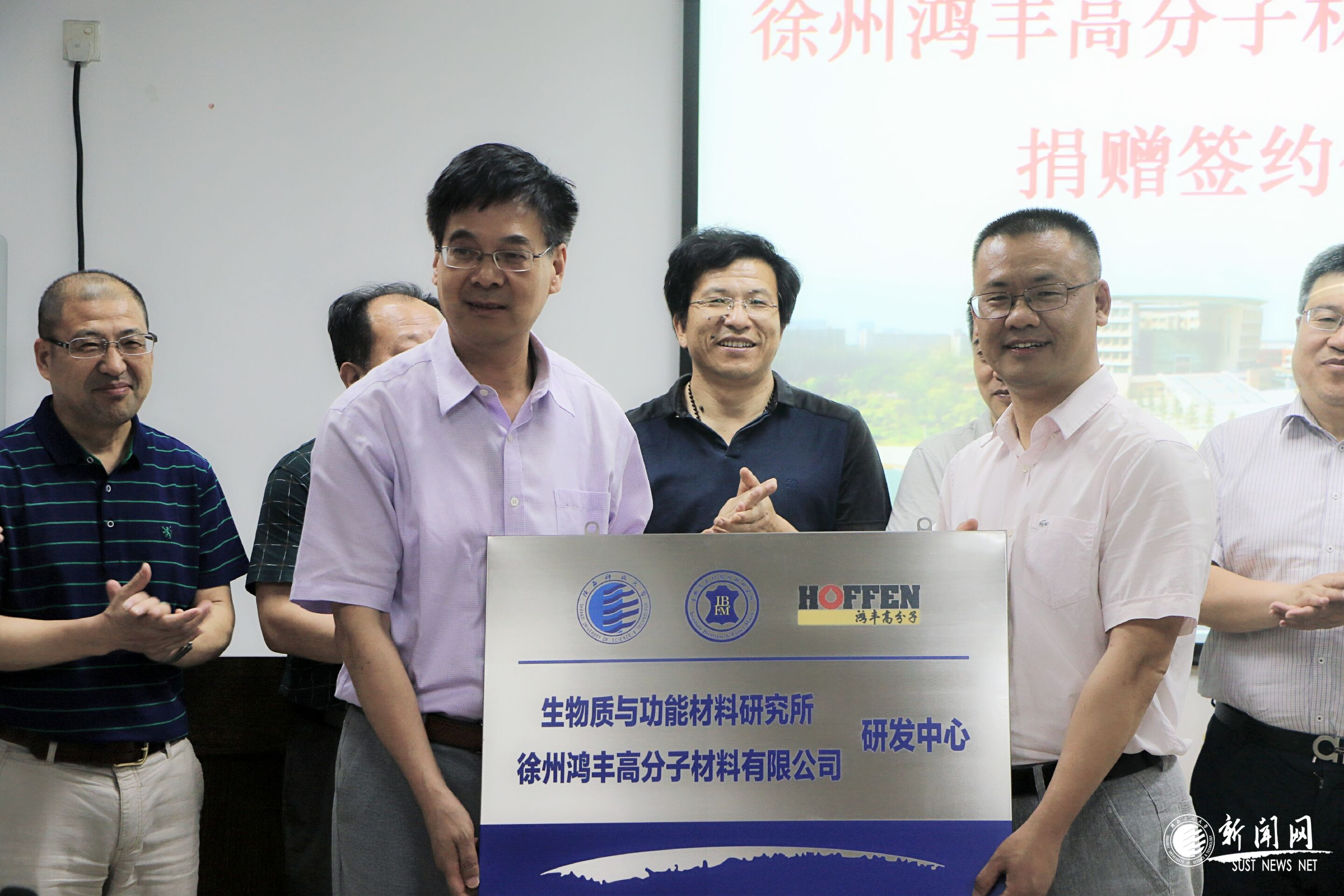 在随后的捐赠签约仪式上,徐州鸿丰高分子材料有限公司向我校捐赠了50万元,用于共建实验室建设和学生奖学金,并与陕西科技大学生物质与功能材料研究所签订了双方共建“生物质与功能材料研究所/徐州鸿丰高分子材料有限公司—研发中心”协议。
