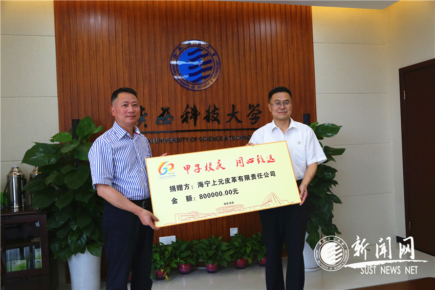 6月25日下午,海宁上元皮革有限责任公司、淄博大桓九宝恩皮革集团有限公司捐赠仪式在逸夫楼416会议室举行。浙江大众皮业有限公司董事长、海宁上元皮革有限责任公司董事长、我校皮90级校友许建新、淄博大桓九宝恩皮革集团有限公司董事长、我校皮87级校友周国祥,我校皮87级校友于明东,校长马建中,校友总会顾问董继先,中国轻工业博物馆馆长王宏,轻工学院党委书记、副院长李新平出席捐赠仪式。陕西科技大学副校长王学川主持仪式。