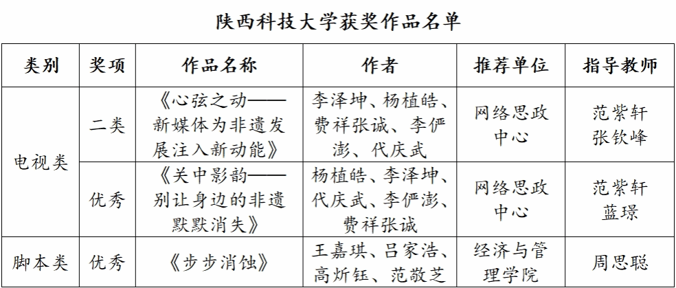 《心弦之动——新媒体为非遗发展注入新动能》获电视类优秀作品(高校通道)二类奖项。作品聚焦新媒体时代背景下非物质文化遗产的传承与推广,展现了现代传播技术为非遗技艺搭建与公众沟通桥梁的创新实践。《关中影韵——别让身边的非遗默默消失》获该赛道优秀奖,作品通过富有感染力的镜头语言,展现了陕西皮影戏等非遗项目的独特魅力,呼吁社会关注濒临失传的文化瑰宝。作品《步步消蚀》获脚本类优秀作品(高校通道)优秀奖。该作品通过精巧的构思和深刻的内涵,揭示了毒品对青少年身心健康的严重危害,有力地升华了珍爱生命、远离毒品的警示主题。