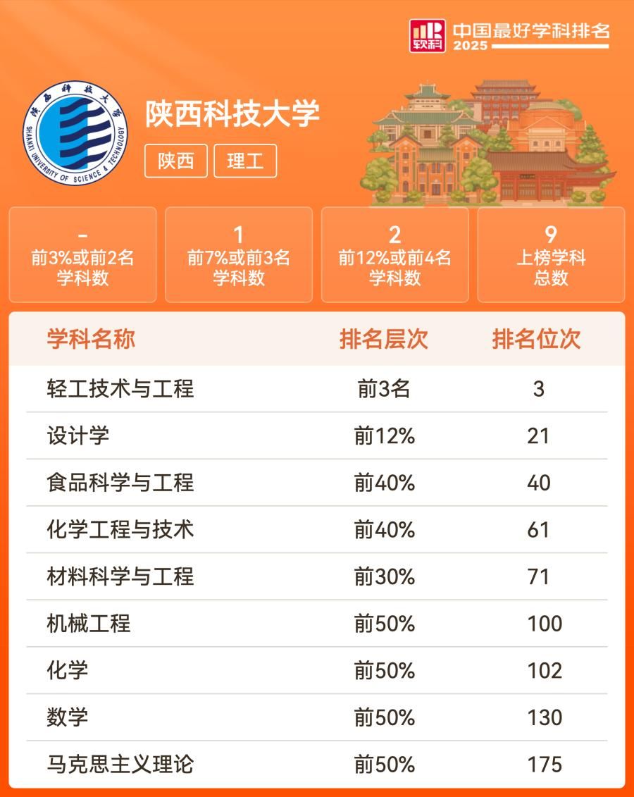 10月15日,高等教育评价专业机构“软科”正式发布2025年软科“中国最好学科排名”,陕西科技大学9个学科上榜。