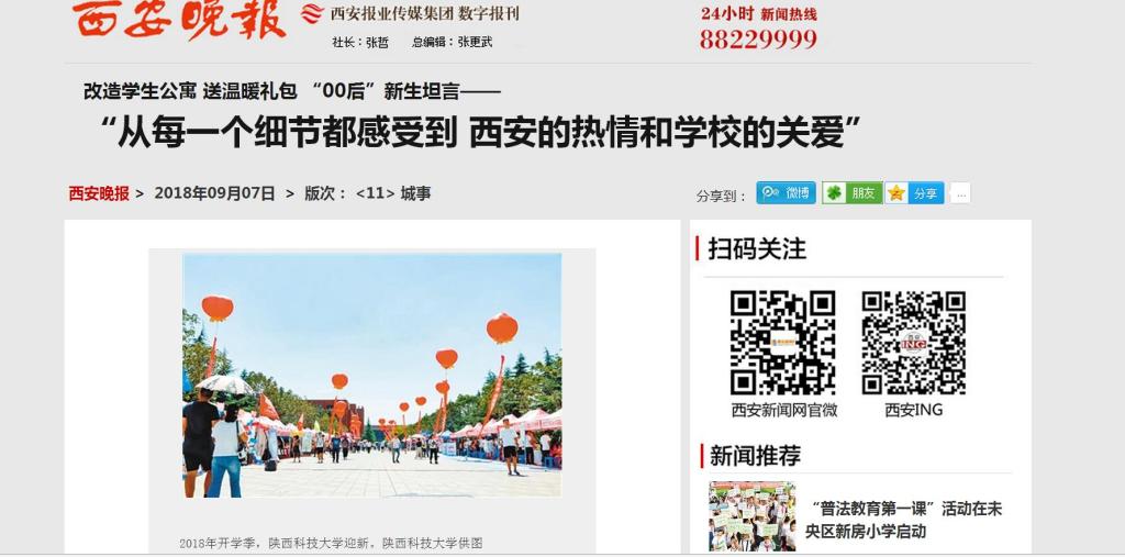 《西安晚报》9月7日以《改造学生公寓 送温暖礼包 “00后”新生坦言——“从每一个细节都感受到 西安的热情和学校的关爱”》为题,报道我校通过改造学生公寓、准备“迎新送温暖礼包”等这些温暖的方式缓解新生“乡愁”,鼓励学生学会独立,尽快适应大学生活。