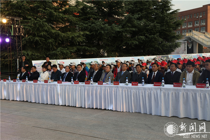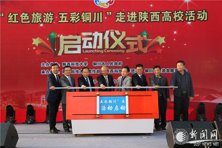 与会领导共同推动活动启动杆,标志着“红色旅游 五彩铜川”走进陕西高校活动顺利启动。