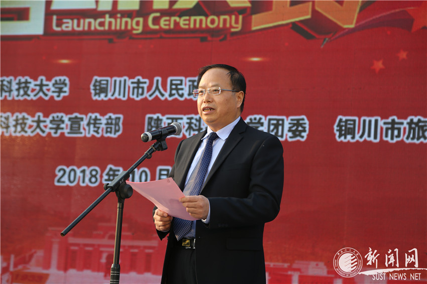 李荣在致辞中介绍了铜川市丰富的自然风光和人文景观、悠久历史和深厚文化。他指出,2018年是陕甘边革命根据地创建85周年,今年8月铜川市被省教育厅授予“青年红色筑梦之旅实践基地”称号,为了更好地发挥青年学生思想教育基地作用,在高校弘扬照金精神,传播红色文化,铜川市举办“红色旅游 五彩铜川”走进陕西高校系列活动。陕西科技大学是与铜川市同龄的新中国第一所轻工高等院校,是陕西省重点建设的高水平大学,本次活动首站选择来到陕西科技大学,就是希望借助学校的良好声誉和办学影响,通过举行“红色旅游”进校园活动,增强当代青年对红色旅游的情感认同和理性认识,让更多青年成为红色旅游的参与者、红色基因的传承者、红色精神的践行者。