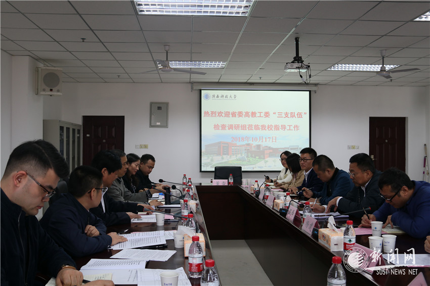 10月17日上午,由西安交通工程学院党委书记李博飞担任组长的省委高教工委第二检查组一行六人对我校辅导员队伍建设、学生心理健康教育和共青团工作进行检查调研。校党委副书记温锋全程参与检查调研活动,组织部、学工部、财务处、教务处、人事处、团委等相关职能部门负责人及部分学院学生工作负责人、心理健康教育专职教师、辅导员参加会议,会议由学工部部长李晓主持。