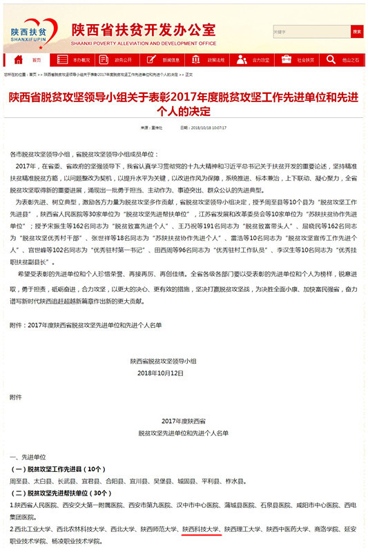 近日, 陕西省脱贫攻坚领导小组在官网公布了《关于表彰2017年度脱贫攻坚工作先进单位和先进个人的决定》,我校荣获全省脱贫攻坚先进帮扶单位荣誉称号。