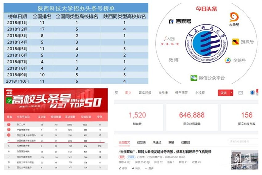 首次打造本科宣传服务“全网矩阵”。继入驻“今日头条”客户端之后,“陕西科技大学招生办”于2018年1月开始,陆续入驻“腾讯企鹅号”“UC大鱼号”“凤凰大风号”“搜狐号”“百度百家号”等主流自媒体信息发布平台,构建我校本科招生在移动互联网领域信息发布的“全网矩阵”,形成对影响力大、受众面广的国内主要自媒体信息发布平台的全覆盖。截止目前发文1012篇,总阅读量超过453万人次。在教育部头条号“微言教育”联合“今日头条”官方对全国千余所高校累计评选的16期榜单中,累计12次进入全国榜单前十五,11次进入全国同类型账号前三名,5次获得全国同类型账号第一,7次获得陕西同类型账号第一。2018年3、4、7月,分别列全国高校第8位、第5位、第4位,均居全国高校同类型账号前3名,持续刷新榜单记录。招生办头条号截止目前发布文章338篇,总阅读量超过400万人次,单篇文章阅读量超过52万人次,部分文章进入“高校头条号文章排行榜“TOP10”。