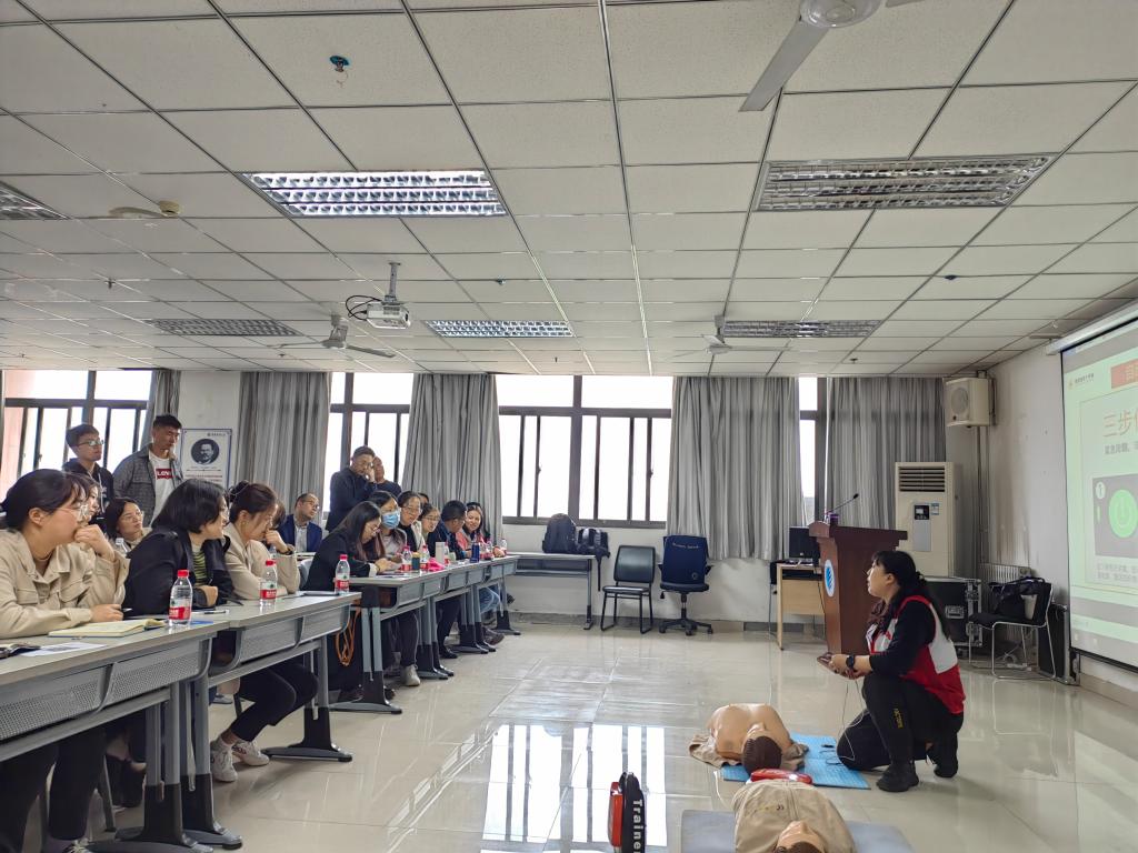 2023年,学工部先后组织后勤服务集团餐厅工作人员、学生处公寓管理中心公寓管理员和二级学院辅导员共150名学员通过培训,取得红十字会CPR+AED救护员证书。近年来,我校依托首批全国急救教育试点学校,充分发挥在科学研究、人才培养、志愿服务等方面的资源优势,构建了“四化四提升”急救教育工作体系,推动学校应急救护队伍建设,加快构建应急教育培训体系,现有应急救护培训师资5名,红十字救护员300余名,持有心肺复苏(CPR+AED)证书师生1026名,他们将更有信心和勇气应对“救”在身边的突发状况,为我校师生加上一道生命保险。自2020年起,我校积极推动大学生应急自救互救技能全员化、普及化发展,将应急救护列入新生军事训练科目,开展宿舍长应急安全技能培训,教育引导学生掌握正确的急救知识,提升自救互救能力,确保大学生急救教育工作抓到细处、落在实处,不断营造“人人学急救,急救为人人”的校园文化氛围。