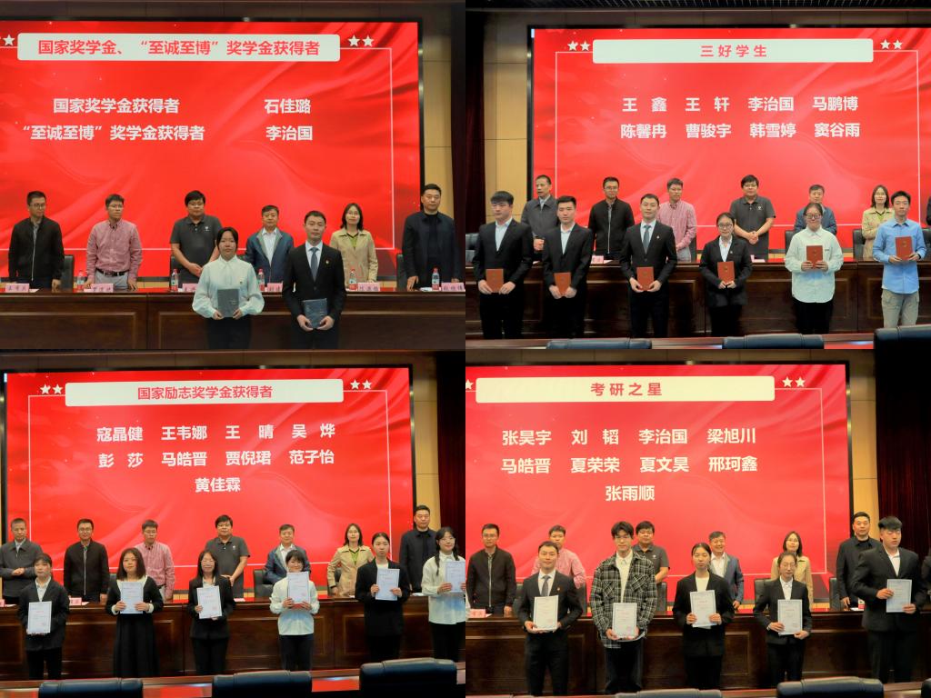 会上,王兴东宣读了《关于表彰“国家奖学金”“至诚至博奖学金”“国家励志奖学金”“三好学生”获得者的决定》,院党委书记陈源梅宣读了《关于表彰“优秀团干”“优秀团员”的决定》,刘建科宣读《关于表彰“考研之星”“科创之星”“英语四级学习之星”“自律之星”的决定》,副院长张鹏伟宣读了《关于表彰“优秀学业奖学金”“优秀学生干部”“学霸宿舍”“优秀舍风宿舍”获得者的决定》,与会老师为获奖学生代表颁奖。颁奖结束后,“至诚至博”奖学金获得者李治国、“优秀团员标兵”郭晓凡、“优秀学生干部”朱骅作交流发言。