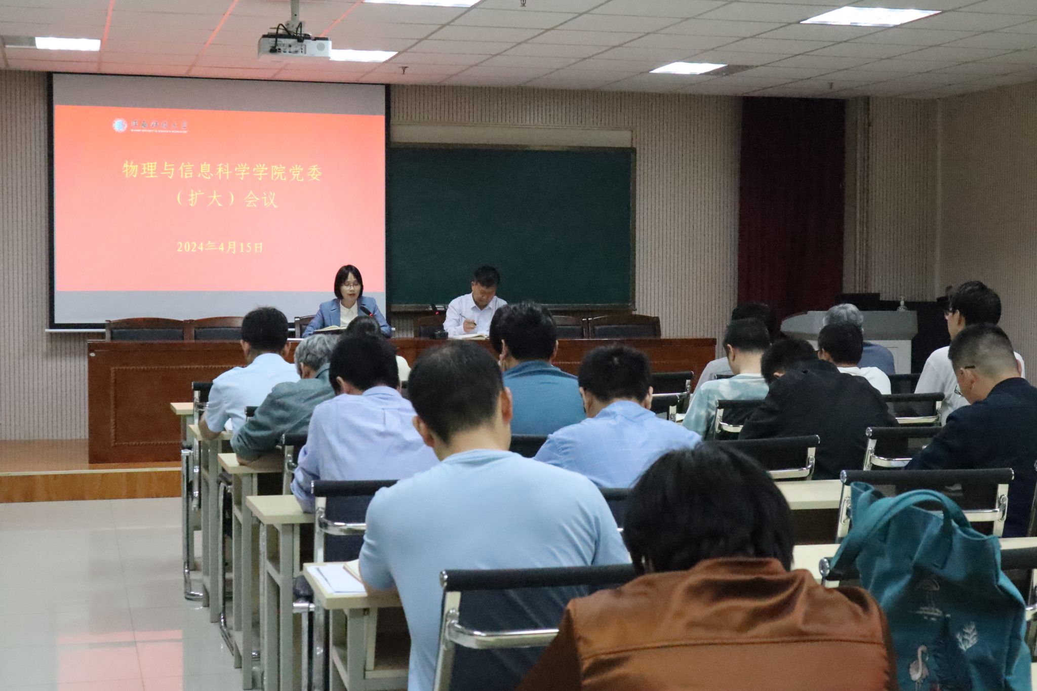 4月15日,物理与信息科学学院党委召开学院党委(扩大)会议,安排部署学院党纪学习教育工作。会议由院党委书记陈源梅主持,学院党委委员、全体教师党员及学生党支部书记、副书记参加会议。