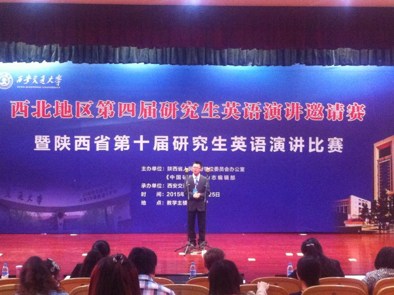 西北地区第四届研究生英语演讲邀请赛暨陕西省第十届研究生英语演讲比赛依托西北地区研究生教育平台领导小组办公室,由陕西省人民政府学位委员会办公室和《中国研究生》编辑部主办,西安交通大学和陕西省研究生外语教学研究会负责承办。本届比赛有来自西北五省及内蒙古自治区69个研究生培养单位94名选手,按照指定题目演讲、即席演讲和现场问答三个环节的展示,评选出一等奖3名,二等奖8名,三等奖12名。
