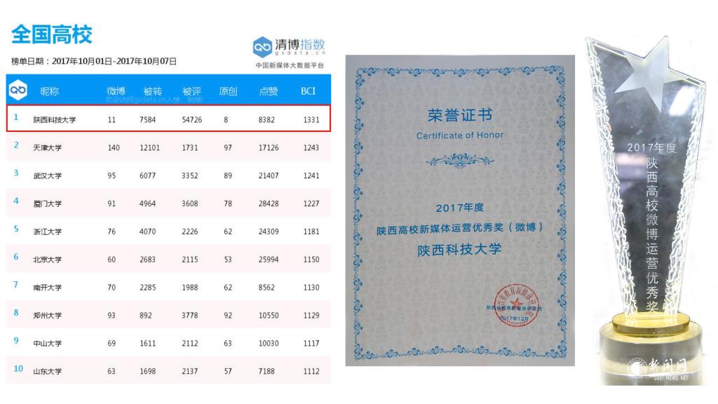 陕西科技大学党委宣传部于2014年先后开通官方微博、官方微信,并于2017年成立观微工作室。截止2017年12月,我校官方微博粉丝已接近2万人,累计发送微博5700余条。我校微博立足校园服务社会,利用自身网络影响力向社会各界传递正能量,在信息传播、引导涉校舆论、舆情应对、网络文化建设等方面发挥重要作用。在全国800多所高校微博影响力排行榜“周榜”中多次位列前茅,最高影响力排名全国第一名。