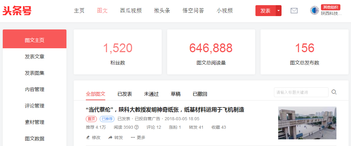 截止2018年1月,在教育部头条号微言教育联合“今日头条”官方评选的榜单中,“陕西科技大学招生办”在全国所有高校头条号榜单中一直位列23位以内,同类型账号中一直排名全国前三甲,四次位居全国高校同类账号冠军。继2017年5月入驻“今日头条”客户端之后,“陕西科技大学招生办”于2018年1月开始,陆续入驻“腾讯企鹅号”、“UC大鱼号”、“凤凰大风号”、“搜狐号”、“百度百家号”等主流自媒体信息发布平台,构建我校本科招生在移动互联网领域信息发布的“全网矩阵”,形成对影响力大、受众面广的国内主要自媒体信息发布平台全方位、多角度、立体化的全覆盖。