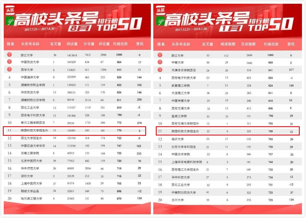 2017年8月和2018年1月排名全国高校头条号榜单第11位,居同类型账号冠军